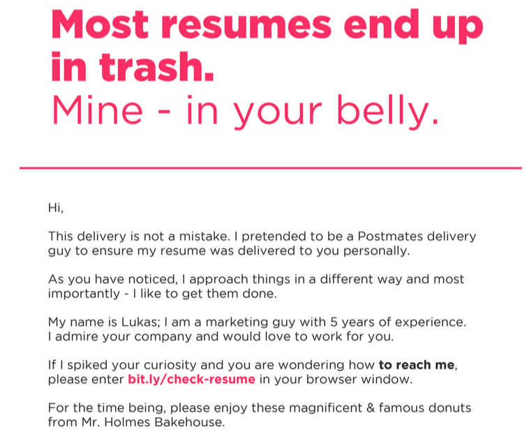 To recreate the entire ensemble, Yla printed out an authentic-looking t-shirt and prepared a pile of doughnut boxes with the clever message “ Most resumes end up in trash – mine in your belly” hidden inside the package.