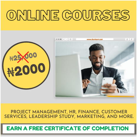 All courses on dovilearn.com are going for N2000 each (about 90% off – no additional fees), plus free Certificate of Completion. We have courses on Management, HRM, Supply Chain, Finance and Accounting, Project Management, Leadership Study, Procurement, Operations and Production, Marketing, Sales, Customer Service, Cloud Computing, and many more courses which can help you to upskill and position yourself in the recruitment market. See all the online courses we have here.