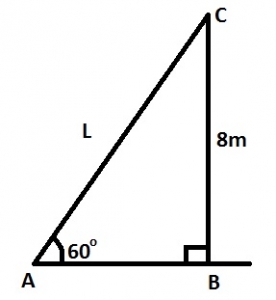 \(sin 60 = \frac{8}{L} = 8 \div \frac{\sqrt{3}}{2}; L = \frac{8}{sin 60}=\frac{16}{\sqrt{3}}\)