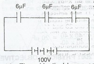 Energy = \(\frac{1}{2}CV^2 = \frac{1}{2} \times 2 \times 10^{-6} \times 100^2\)