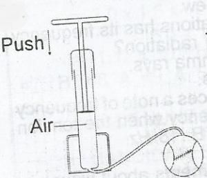 The outlet of a bicycle pump is used to inflate a football as illustrated in the diagram above. Why does the pressure of the air inside the pump increases as the pump handle is slowly pushed downward at constant temperature?