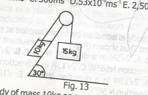 a body of mass 10kg on a smooth inclined plane is connected to a smooth pulley to a mass of 15kg as shown above, the acceleration of the system is