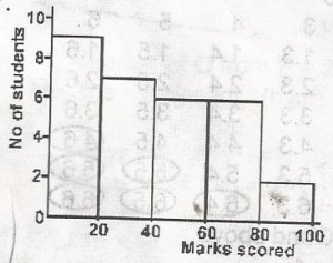 \(\begin{array}{c|c} Marks & 20 & 40 & 60 & 80 & 100 \\ \hline students & 9 & 7 & 6 & 6 & 2\end{array}\)