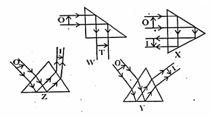 The diagram above illustrates a beam of parallel rays from a distant object O, incident on one side of the total reflecting prism. Which diagram does not represent the correct path of the beam when it emerges from the prism?