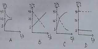 Two identical cups containing the same volume of water at 45°C and 5°C, are left in a room at 25°C. Which of the following graphs correctly illustrates the variation of temperature with time?