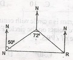 The position of three ships P,Q and R at sea are illustrated in the diagram. The arrows indicated the North direction. The bearing of Q from P is 050o and < PQR = 72o. Calculate the bearing of R and Q
