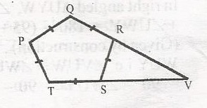 In the diagram, PQRST is a regular polygon with sides QR and TS produced to meet at V. Find the size of < RVS
