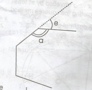 Let a represent an interior angle; e represent an exterior angle. A section of the polygon is down in the diagram.