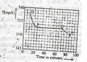 Use the graph above to answer this question. A sample, X, solid at room temperature, was melted, heated to a temperature of 358 K and allowed to cool as shown in OPQR.The section OP suggests that X is in the