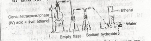 Caustic soda, \(NaOH\) , serves to remove gaseous impurities from the gas evolved during the laboratory preparation of ethene. Basically, the major impurities are Sulphur (IV) oxide and Carbon (IV) oxide.