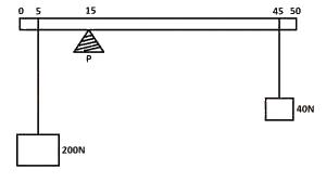 In the diagram above, a rod 50 cm long of uniform cross-section is suspended horizontally on a fulcrum, F, by the action of two forces. What is the weight of the rod?